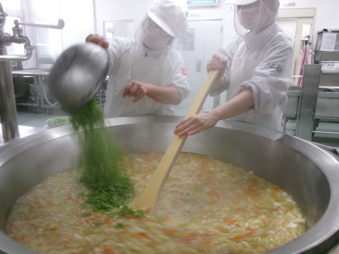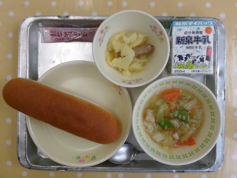 献立は「コッペパン,牛乳、春野菜スープ,ウインナーポテト,いちごジャム」でした。春野菜スープには,春が旬の絹さやと春キャベツ,たまねぎがはいっていました。「給食はおいしいね♪」と1年生。給食時間を楽しんでいます。