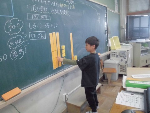 算数では,たしざんのひっ算の勉強が始まりました。ブロックを使ったり,絵や図を使ったりと,様々な方法で説明をしました。
