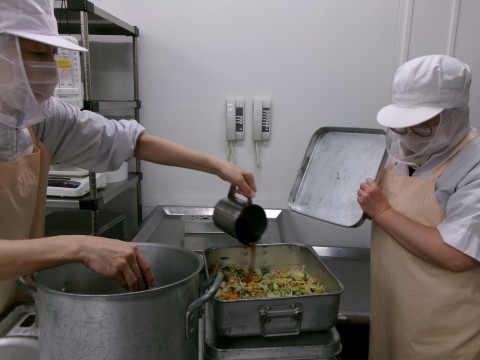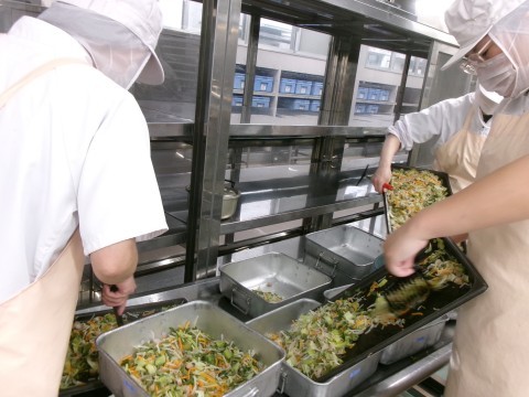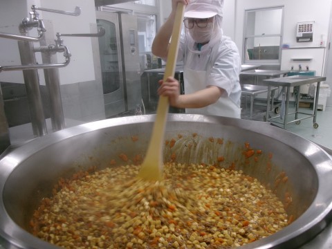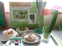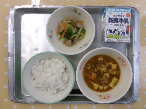 献立は「ご飯,牛乳、カレー豆腐,もやしとチンゲン菜のサラダ」でした。豚肉と豆腐・野菜をいれてカレー味のおかずをつくりました。さっぱり味のドレッシングがかかったサラダはオーブンで蒸し焼きにしてつくりました。