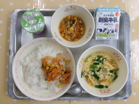 献立は「ご飯,牛乳、にらたまスープ,混ぜたらチャーハン,フルーツゼリー(ぶどう)」でした。「このスープ大好き♪」と5年生。一週間がんばりましたね。にらは,スタミナ野菜と言われ,強い香りの成分には疲れを回復する働きがあります。