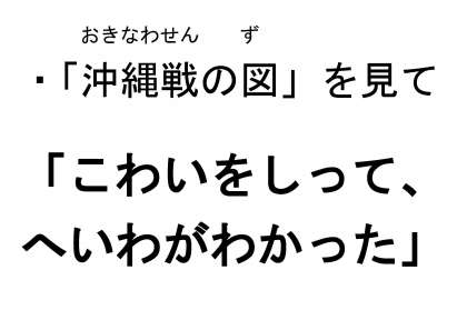 この詩は,この児童が,宜野湾市の佐喜真美術館を家族と訪れ,「沖縄戦の図」に描かれた,集団自決や戦場を逃げ惑う人の様子を見たときの思いを表現したものです。