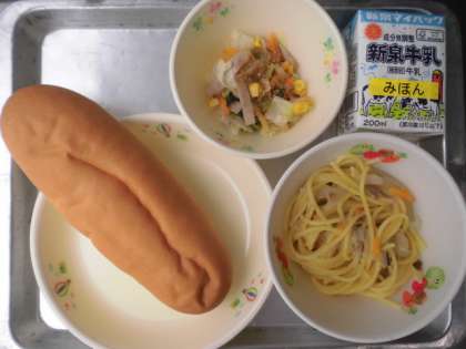コッペパン,牛乳,ペペロンチーノ,小松菜とにんじんのごまあえ