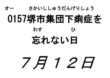 26年前の平成8年7月,本市において,学校給食に起因する腸管出血性大腸菌O157による学童集団下痢症が発生しました。9000人以上の児童・教職員が罹患するとともに3人の尊い命を失ったことについて,二度とこのようなことを繰り返さない,そして,風化させないことを目的に,7月12日が,「O157 堺市学童集団下痢症を忘れない日」と制定されています。