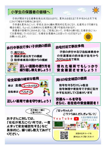大阪府警察本部交通総務課より,「夏休みにおける交通事故防止について」のリーフレットが届きましたのでお知らせします。