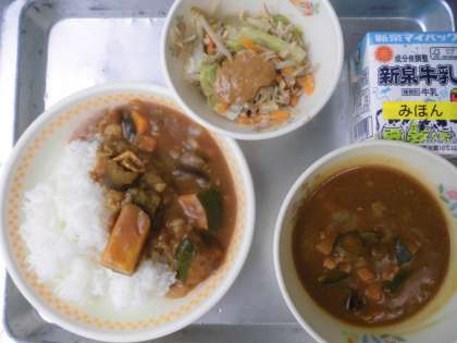 今日のカレーライスには「なす,かぼちゃ,トマト」が入っていました。