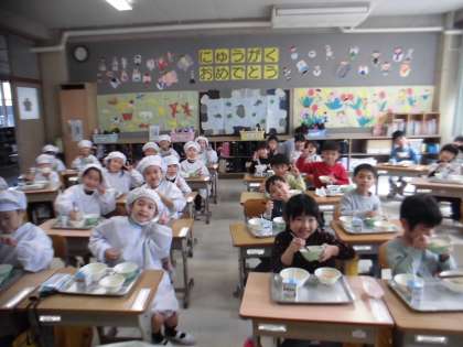 待ちに待った給食がスタートしました。重たい食缶を運び、上手にお皿に盛り付け、大きな声で「いただきます!」
