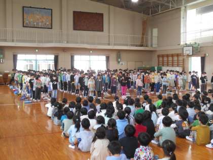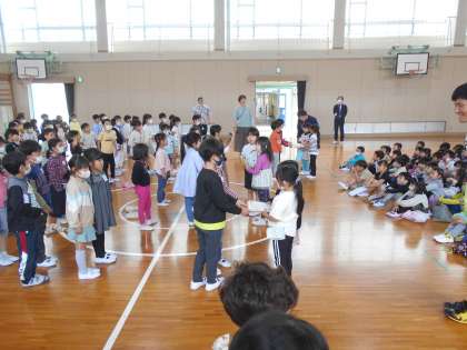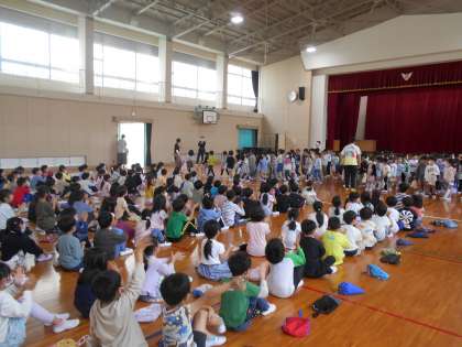 1年生のお迎え会を体育館で行いました。2年生が元気に校歌を歌ったり、朝顔の種をプレゼントしたりして、素敵なお迎え会ができました。