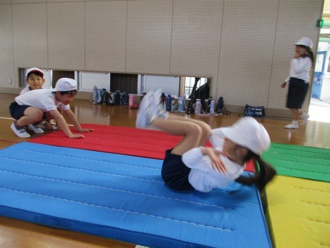 体育館では、ハードル走につながる運動でいろんな障害物をとびこえる練習をしています。