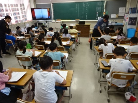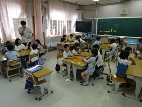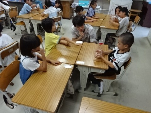 算数では「どちらが おおい」の学習をしています。班に配られた形が異なる2つの入れ物に、どちらが多く水を入れることができるか比べる方法を考えました。