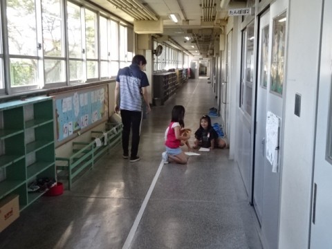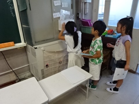 算数で「どちらが おおい」の学習をしています。形の異なる2つの容器に入る水のかさを比べる方法を考えました。