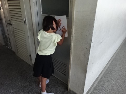 図工ではクレパスで扉や壁などの凸凹をこすりだす活動をしました。こすりだした模様をもとにして絵に仕上げていきます。