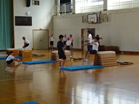 体育では「跳び箱運動」の学習をしています。閉脚跳びや台上前転,台上伸膝前転に取り組みました。