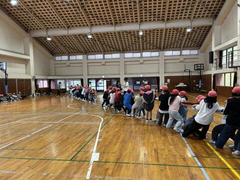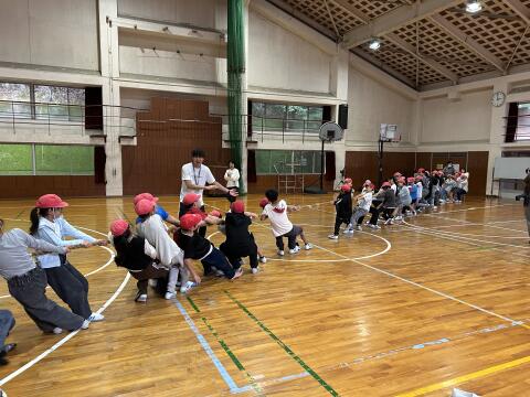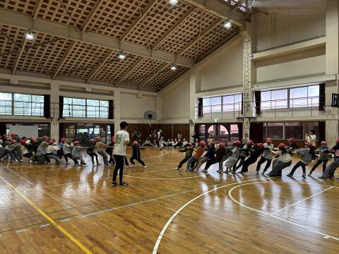 山登りが予定より早く終わったので、体育館で綱引き大会です。