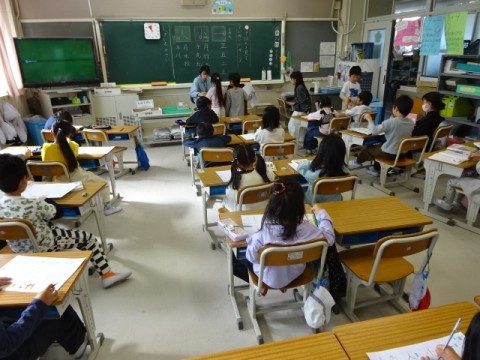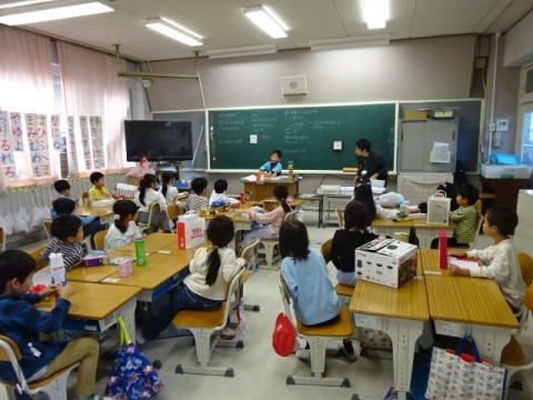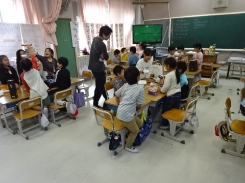 算数で「かたちあそび」の学習をしています。班で箱を積み重ねる活動をしました。積み重ねた箱が崩れないようにするためのポイントを考えて交流しました。