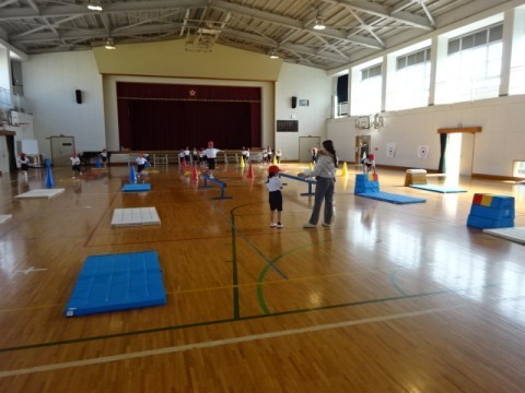 体育では平均台やマット,跳び箱をコース上に設定して,順番に通っていく活動をしました。