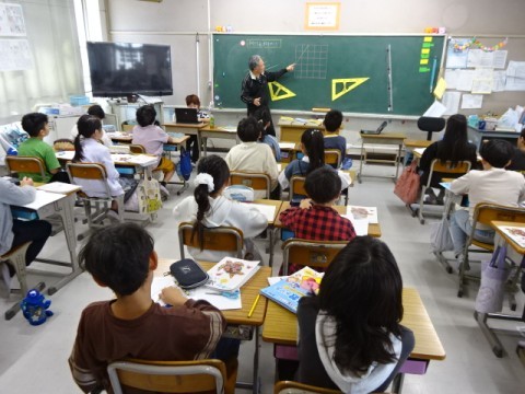 算数で「垂直,平行と四角形」の学習をしています。2本の直線の関係のなかで,接していないが延長線を交わらせると直角に交わるものについて考え,意見を交流し,垂直な関係であることを確認しました。また,三角定規を使わずに方眼で平行な直線をかくことに挑戦しました。