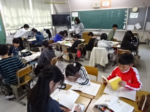国語では「慣用句」の学習をしています。教科書に記載されている慣用句の意味を,班で協力して調べていきました。