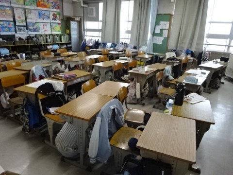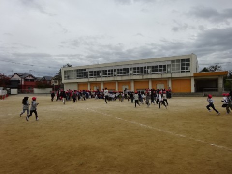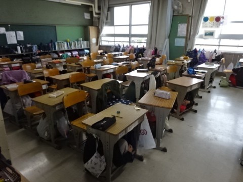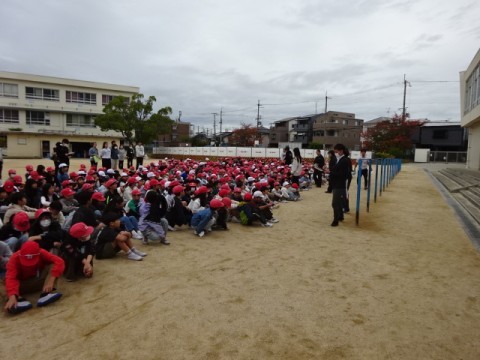 大阪880万人訓練に合わせ,授業中に大きな地震が発生したという想定で避難訓練を実施しました。地震発生時には素早く机の下にもぐりこむことができていました。また,放送と先生の指示をよく聞いて運動場に避難することができました。