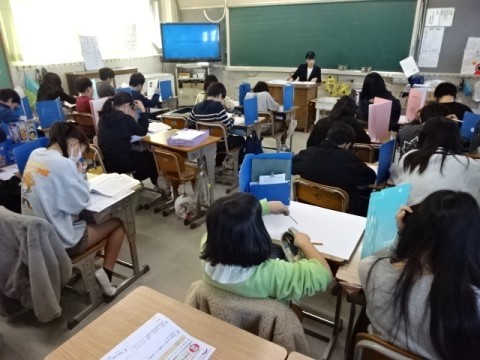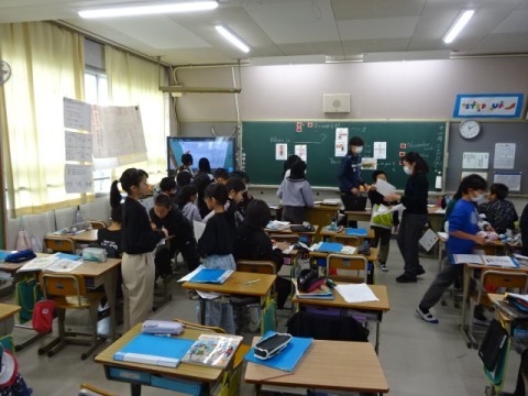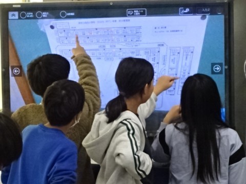 外国語の学習では学校内にそれぞれが宝のある場所を決めて,行き方を go straight,turn right等の英語で説明する宝の地図を完成させていきました。