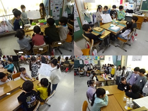生活科での「おもちゃまつり」交流をしました。2年生から1年生へおもちゃを作るための説明をしたあと,実際に作ってみました。