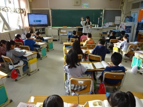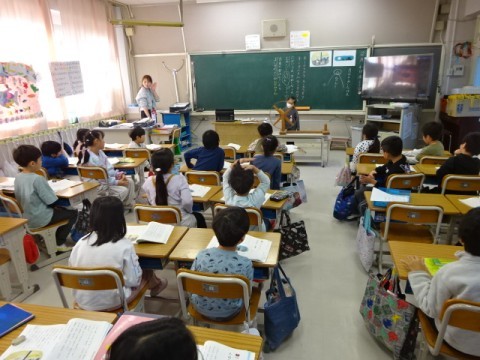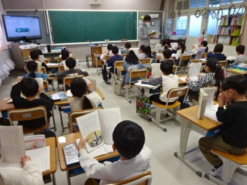 国語で「たぬきの糸車」の学習をしています。先生と一緒にしっかりと声を出して本読みをしました。本文を読みながら,場面がかわるところを確認しました。また,糸車の音の読み方を実際の糸車を回して聞こえる音と比べて考えました。