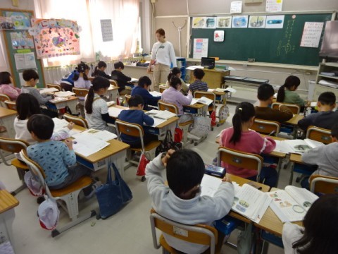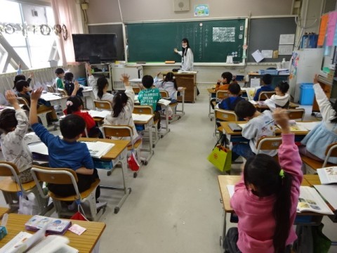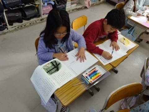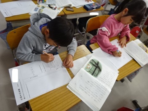 国語で「たぬきの糸車」の学習をしています。お話の中の好きな場面を見つけ,好きな理由も書いていきました。