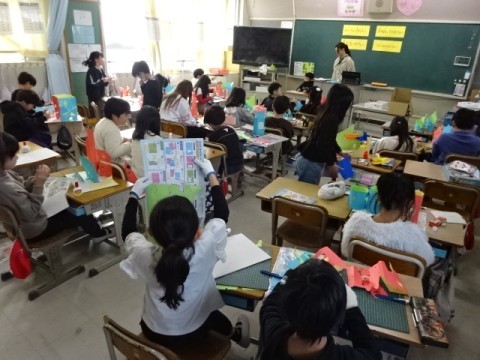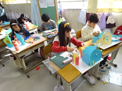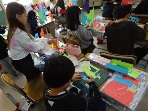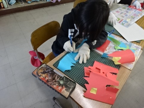 図工では「まどをあけたら」の作品づくりに取り組んでいます。どんどんイメージを膨らませて自分だけの作品に仕上げていっています。