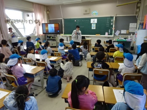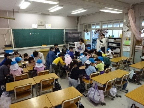 はじめに,1・2・3組の教室に分かれて入ってもらい,担当する園児と一緒にプリントに取り組みました。