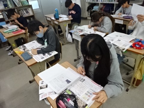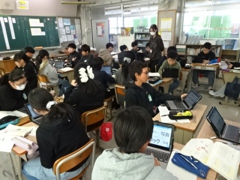 社会科では「国力の充実をめざす日本と国際社会」の学習をしています。映像や教科書の資料をもとに,憲法や国会ができてからの政治について,また,日清・日露戦争中の日本の国内の様子について,ノートにまとめていきました。