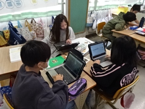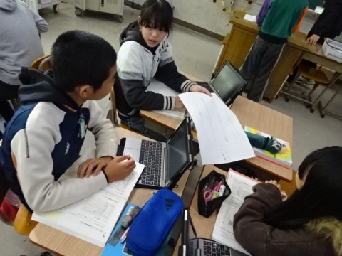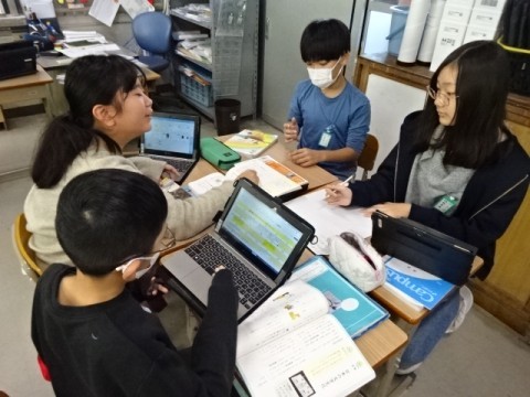 国語で「おすすめのパンフレットを作ろう」の学習をしています。グループでパンフレットの内容について構成や割付を相談しました。