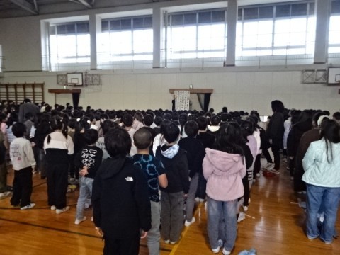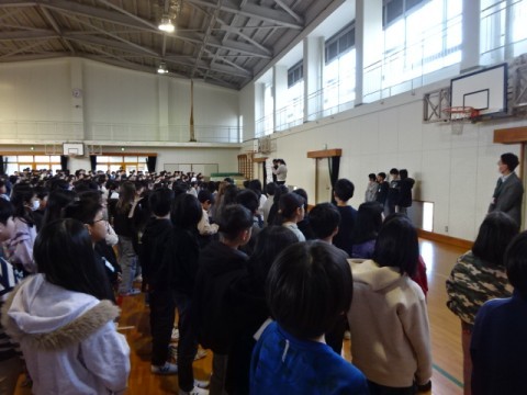 校歌を1番から3番まで歌った後,校長先生から「新年にあたっての目標」「終業式で話したことの確認」「今の学年の締めくくりと次の学年に向けての準備」の話がありました。
