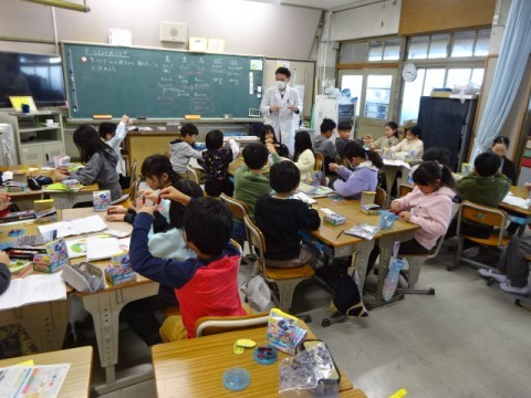 理科で「じしゃくのふしぎ」の学習をしています。磁石と磁石の間に物が挟まってもくっつくかどうかを実験して確かめました。