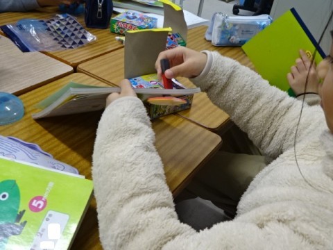 国語では「詩のくふうを楽しもう」の学習をしています。教科書に載っている詩を参考にして,自分で詩をつくることに取り組みました。また,これまでに習った漢字の中から一人一文字ずつ選んで「漢字かるた」を作りました。