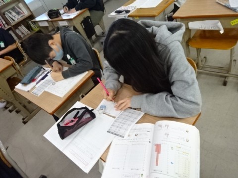 算数で「データを使って生活を見なおそう」の学習をしています。クラスの1人ひとりの家庭学習の時間をデータとしてヒストグラムに表すこととそこから分かる傾向を考えることに取り組みました。