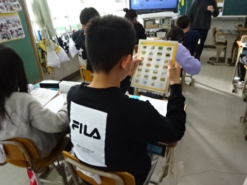 外国語の学習では動物と食べるものを結ぶ活動から始め,ピクチャーディクショナリーを活用して動物の名前等の英語を調べて「eat」を使った文章を書く活動まで取り組みました。