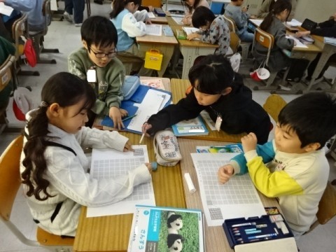 算数では「4けたの数」の学習をしています。数のまとまりを意識して100を単位として数をとらえたり,10000個ある●を工夫して数えたりしました。