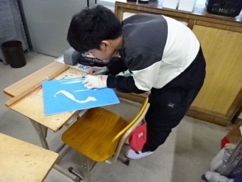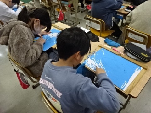 図工では版画の作業を進めました。