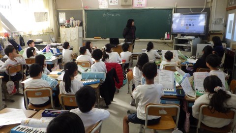 音楽はパソコンで鍵盤ハーモニカの演奏の見本を聴き,曲の感じ方を話し合っていました。