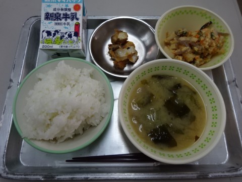 今日の給食は,ごはん,みそ汁,焼さばのみぞれがけ,うの花です。