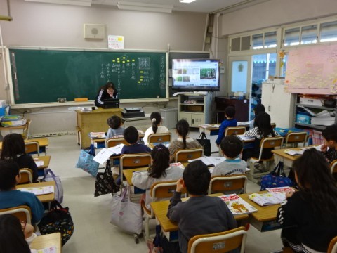 新出漢字の学習も進んでいます。「林」の文字について知っている言葉を交流し,わからない言葉については先生が調べてテレビ画面に提示してみんなで共有しました。