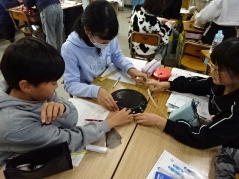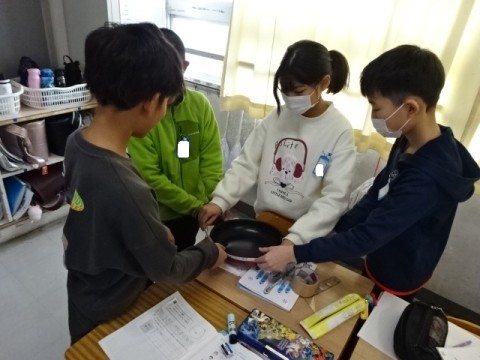 算数では「正多角形と円周の長さ」の学習をしています。円の形をしたいろいろなものの円周と直径の長さを調べて,円周の長さと直径の長さのきまりについて考えました。