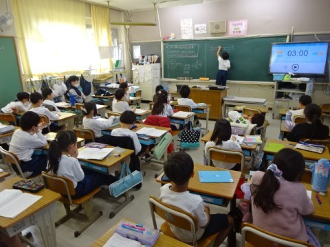 算数で「たし算と ひき算」の学習をしています。テープ図をもとに問題文の数量関係をとらえて「もとの数」を求める問題に取り組みました。