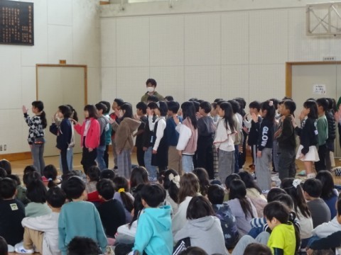 6年生を送る会(2部)での3年生の出し物の様子です。手話付きで6年生に歌を届けました。