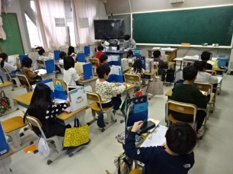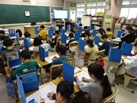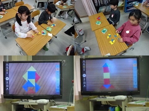 算数で「かたちづくり」の学習をしています。直角二等辺三角形の色板を複数枚並べていき,いろいろな形を作っていきました。
