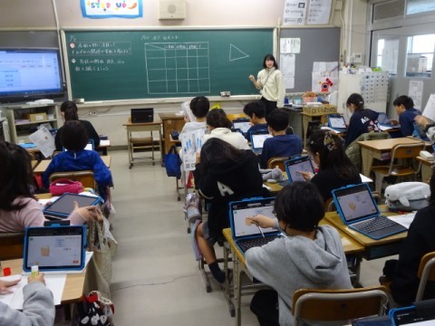 算数では「正多角形と円周の長さ」の学習をしています。角柱について,底面の頂点の数や側面・頂点・辺の数について表にまとめていきました。
