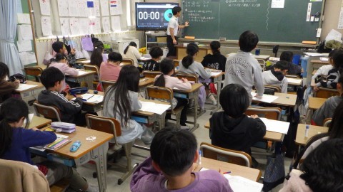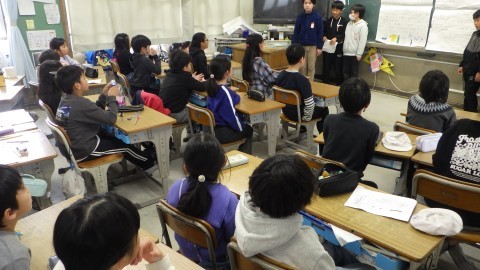 総合では,4年生が調べた環境問題についての発表を聞いて交流していました。
