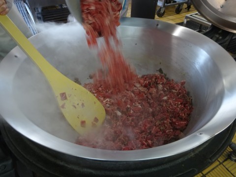 にんにくと牛肉を炒め,にんじん・たまねぎとさらに炒めた後,