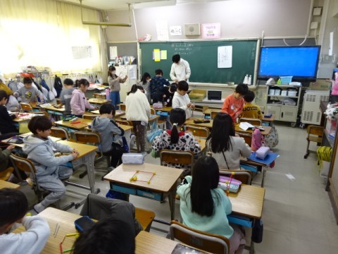 算数では「はこの形」の学習をしています。辺の長さや本数と頂点の数をもとに箱の形の骨格模型を作りました。