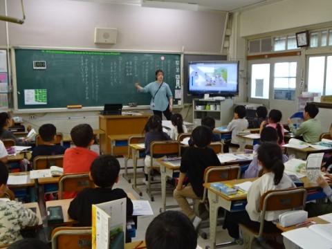 テレビに映し出された絵を見て、「どこで」「どんな人が」「なにをしている」という順で文しょうを作っていました。
