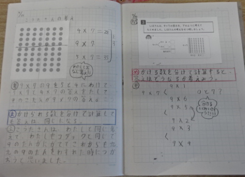 「9×7」は2年生の時に「九九」で学習しましたが,様々な考え方で答えを導くことができます。